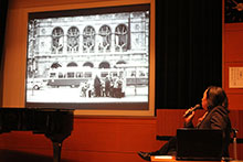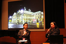 後半は、行天准教授とのトークで、生い立ち、歌を志した契機、大学での学生生活、アメリカやイタリアでの修行、そしてウィーンでの専属オペラ歌手としての試練を次々にお話しいただきました。途中、甲斐氏が出演したウィーン国立歌劇場を紹介するテレビ番組が放映され、歌劇場の裏舞台も分りやすく説明いただきました。また、「中学校時代に合唱部に入り、みんなで歌う喜びを知ったことから始まり、デル・モナコというテナー歌手が歌うカンツォーネのレコードを聴き、『声から光を感じ』、この世界に行きたいと考えた。」「ウィーン国立歌劇場では毎日異なる演目が上演されているために、専属ソリストとしてカヴァー(配役に欠員が出たときの代役)に入ることが求められ、5つものオペラ作品を同時に歌わねばならず、死ぬ気で勉強した経験を経て、今の自分がある。」と、『オペラへの道』を語っていただきました。最後に、ライカ製のフィルムカメラで撮ったウィーン街角風景の白黒写真を紹介していただきました。こちらも写真集を出版するほどの腕前で、光を感じさせる素晴らしい作品に、来場された方がたも感動されていました。
