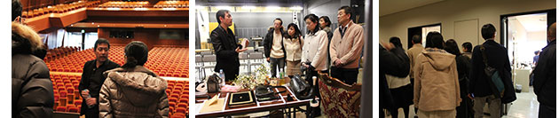 そんな中、2日目舞台の直前となる10日11時より、「フィガロの結婚」SS席のチケットを購入していただいた方の特典であった「バックステージツアー」を開催しました。当日は10名の方がツアーに参加、演出を担当した飯塚励生氏と本学音楽科 行天祥晃准教授がナビゲートを務めました。