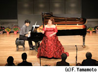 トリを飾ったのは、メゾソプラノの山口優里菜さんの歌声(ピアノ伴奏:山中惇史さん)。山口さんは、本学を卒業後、2013年に東京藝術大学声楽科を首席で卒業。演奏曲目は、①G.ロッシーニ: 誘い(いざない) ②山中惇史: たんぽぽ ③C.サン・サーンス: オペラ「サムソンとデリラ」より『あなたの声に我が心は開く』 ④G.ヴェルディ: オペラ「ドン・カルロ」より『むごい運命よ』。 歌曲からオペラアリアまでバラエティに富んだ演奏曲目を豊かな声量と見事な表現力で歌い、その迫力があり、艶やかな歌声に、多くの聴衆は魅了されました。