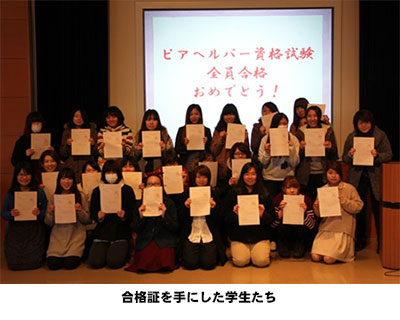 学生たちは、心理学の授業の中で、カウンセリングの基礎的な知識を習得し、またコミュニケーション実習を行って、人の心を理解し、話を聞いて気持ちをくみ取る力を実践的に学習してきました。「授業での試験対策が役に立った」「カウンセラーと相談者の役割を体験する実習で理解が深まった」「人と関わることの楽しさを知った」「日常生活でもピアヘルパーの試験で学んだことが生かせそう」といったような感想が聞かれました。