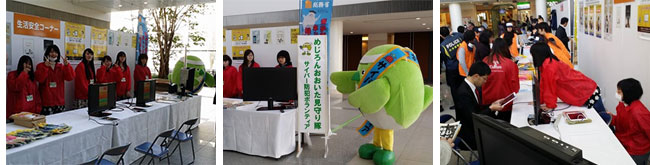 2月14日、iichiko総合文化センター1階アトリウムプラザで、大分県警「ふれあい展示会」が開催されました。この会場は、昨年から本学のサイバー防犯ボランティア「めじろんおおいた見守り隊」の学外の晴れ舞台の場にもなっています。