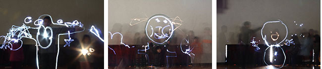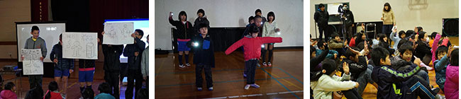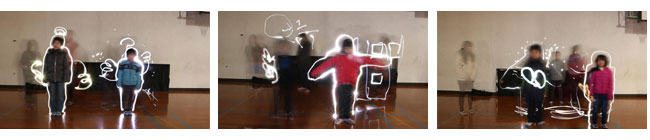 早朝から上北小学校でライトペインティングの最終テストとリハーサルを行い、5、6年生にやり方を教えました。子どもたちは1年から6年生までチームになって協力して図案を作り頑張りました。
