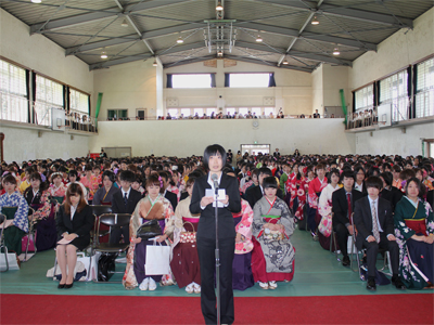 3月23日(月)、本学体育館で「第53回卒業式・第35回専攻科修了式」を執り行いました。式は音楽科学生によるオーケストラ演奏に導かれ、さらにコーラス隊も加わって「大学賛歌」を一同斉唱し荘厳に始まりました。