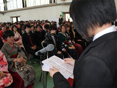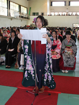 卒業生を代表して国際総合学科の前田里奈さんが「先生や職員のみなさま、地域のあたたかい支えと、見守ってくれた家族に感謝します」と答辞を述べました。