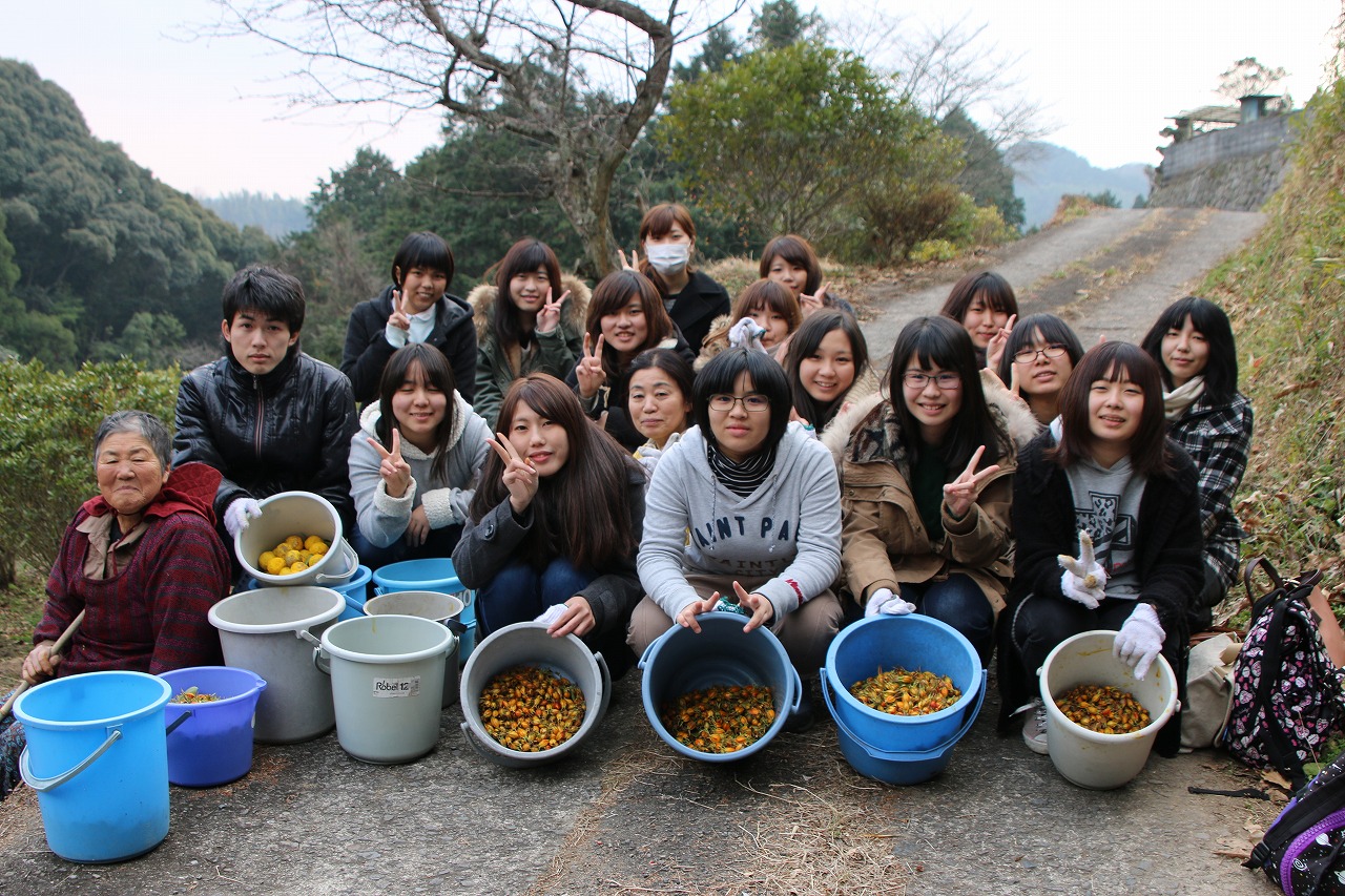 1月11日大分市福宗岩下地区にクチナシの実収穫を手伝いに行ってきました。国産のクチナシの実を育てている農家さんは減少しているなか、この地区に住むおばあちゃんがお一人で栽培を続けています。収穫時期はご高齢のおばあちゃんお一人でままならないというお話しを伺い、昨年から学生たちがお手伝いに出向いていました。このクチナシの実は、臼杵の黄飯や法隆寺のお水取りに使われる椿の造花の染色にも使われています。