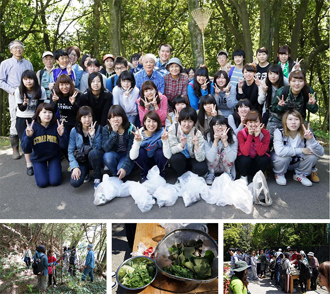 上野の森の会は、周辺住民の方々と上野の森に関心を持つ人々が専門家と話し合いながら活動を行っています。毎月第4日曜日に上野の森を守る清掃などの活動を行っています。新学期4月26日は40人以上の学生がサービスラーニングで参加、森の清掃や整備を手伝いました。
