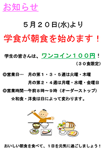 朝食を摂らない大学生が多いと言われる昨今。本学では学生の健康増進と生活慣習の見直しを目的に、学生食堂で朝食サービスを5月20日(水)から始めます※。(一日30食限定)