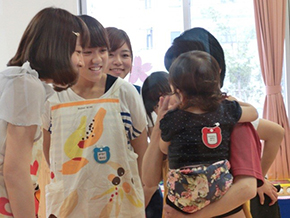 1~2歳のお子さんが多く、お父さんと離れることで泣いてしまうお子さんもいましたが、学生たちは抱っこしたり、様々な遊びをしたり工夫して、楽しい時間を過ごしてもらうようにしていました。日頃あまり子ども達と接する機会がない学生も多いのですが、自分から積極的に関わりを持とうと奮闘していました。