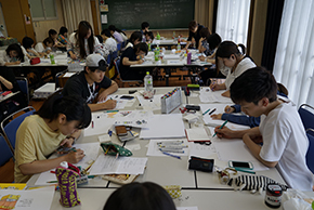 8月7、8日に美術科デザイン専攻プロダクトデザインコースは「第3回デザイン合宿“デザインキャンプ100@宇曽山荘”」を行いました。これは2日間でアイデアスケッチ100案創出を目標としています。スケッチのスキルとデザイン思考を養うためのトレーニングですが、互いに話をしたこともない短大1年生から専攻科2年生まで4学年が一緒に机を並べ同じ課題に取り組むという、普段の授業とは違った環境でコミュニケーション力も養います。