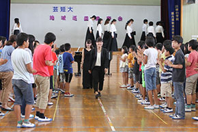 日出町立川崎小学校で9月10日(木)、地域巡回演奏会を開催しました。本学音楽科学生ら39名が全校児童、教員、地域住民ら約400名を前に、オペラハイライト・ピアノソロ・打楽器アンサンブル・金管5重奏・女声合唱を披露しました。