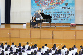 ピアノのソロでは国東中学校出身の小田弥生さん(音楽科2年)が幻想即興曲(ショパン)などを巧みに演奏。小田さんは「自分たちが専門としている音楽を演奏することで中学生になじみのないクラシックを少しでも知ってもらうことができたら嬉しいです」と語りました。また「卒業生として成長した姿を後輩に見てもらいたい」とも話しました。