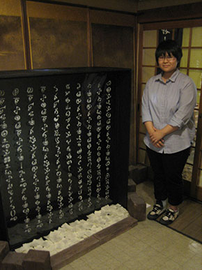 2階の「将棋処と」には上野莉子さんがインスタレーション作品を展示しています。将棋を楽しむ和の空間に“Fit”させるために、「日本人とは何か」を考えたそうです。そうして、察する心・思いやる心を作品テーマとし、孟子の「不忍人之心」(人の不幸を見過ごせない気持ち:現代語訳はサイト「漢文塾」よりhttp://kanbunjuku.com/archives/102)を独自の“象形文字”で表しました。光を当てて文字が浮かび上がる様子は、作品の世界観だけでなく、見た目にも奥行きを出しています。上野さんは「普段は味わえない場所での展示です。ぜひ作品と共に空間全体を感じてください」と来場を呼びかけています。