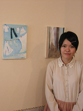 同じく2階の「おにぎりかふぇ」では上尾若菜さんがイラスト作品を展示。上尾さんの日常などを幻想的に表現しています。別大国道のサイクリングコースから見た大分の夜景など、多くの人が見たことある風景が、幻想的で印象的なタッチで表現されていて、親近感がわきます。上尾さんは「個性あふれる空間です。ぜひお越しください」とほがらかに話します。