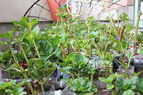 7月、あじさいの挿し木を本学周辺の住民の皆さんに分けていただきました。その数1000本!そして、鉢代わりとなる使用済みペットボトルも集めました。それから現在は育成中です。研究室のベランダではこの夏の暑さを乗り切ったあじさいたちがすくすくと育っています。地域住民の皆さんにも鉢を渡して育ててもらっています。