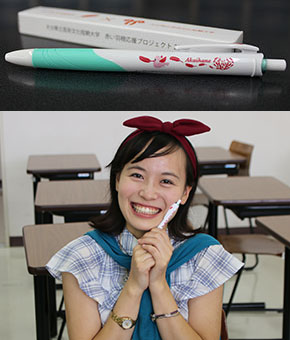 現在、ボールペンは地域活動室(人文棟)や本学事務局で取り扱っています。文具商組合加盟の一部文具店でも取り扱っています。ぜひ赤い羽根共同募金にご協力ください。このボールペンを胸ポケットに挿すと、「赤い羽根」をさりげなくアピールすることができます。