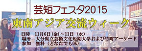 芸短フェスタ「東南アジア交流ウィーク」、11月6日(金)の19時に、芸文短大にて開会式を予定。7日(土)、8日(日)には大分県・芸術文化ゾーン(県立美術館と総合文化センター付近)にて、交流ワークショップ・展示・招待講演(明治大学・Prince of Songkla大学)を予定しております。最新情報につきましては、下記リンクを参照ください。 |