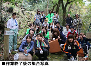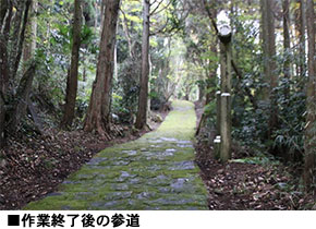作業開始当初、全長800m以上もある参道を整備することに不安を持つ一同でしたが、活動が始まったとたん、黙々と作業に専念しました。作業終了後の太田氏のコメントの中にも「私は初め、参道全てを整備することができないのでは…と思っていましたが、全てやり遂げましたね。凄いことですよ!」と、私たちへ労いの言葉をかけてくれました。