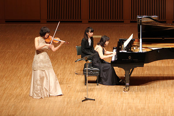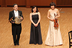 プログラム前半はバッハとベートーヴェンのヴァイオリン・ソナタ、プログラム後半はブラームスのホルン・トリオが演奏されました。プログラム前半では厚みのある宮添専任講師のダイナミックなピアノの響きに、川瀬教授のシャープなヴァイオリンの演奏が好対照をなし、ヴァイオリンとピアノというミニマムな編成を超えたスケールの大きな音楽がつむぎだされました。