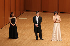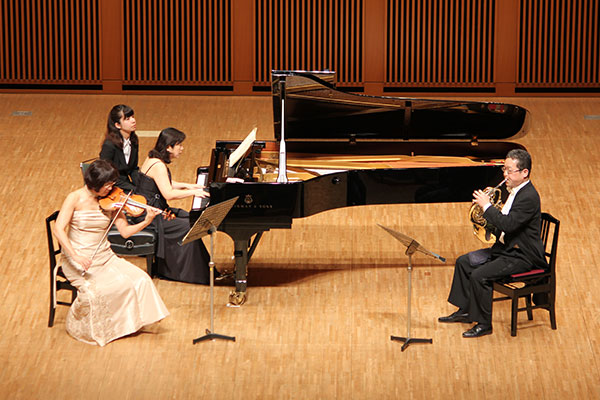 後半では最初にステージ上で演奏者によるミニ・トークが行われ、和やかな雰囲気の中、ブラームスのホルン・トリオが演奏されました。ここではピアノとヴァイオリンに加え、清水教授のすべてを包み込むような上質でメロウなホルンの音がホールに満ち、来場されたお客様からは惜しみない拍手が送られました。アンコールでは同じくブラームスの子守唄が3人のアンサンブルで演奏されました。