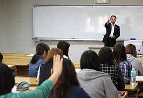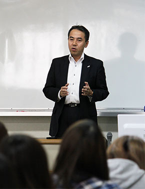 情報コミュニケーション学科の社会起業論の講義では、社会をフィールドとした起業とは何かをテーマに講義展開をしています。その時、欠かすことが出来ないのが、資金という「お金」との関係です。この講義では、全15回の講義中3回、三井住友銀行の和田友宏・大分支店長をお招きし、リアルな現場と起業の関係についての知識を習得します。