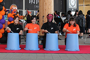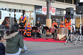 ステージは迫力あるファンファーレで始まり注目を集めました。そして間髪を入れずに始まった打楽器による「Greetings to Hermann」(ハーマンへの挨拶)、バケツを楽器にした「Stickin` Garbage」。軽快でキレの良い打楽器の演奏が秋空の下に響き、それを耳にした人がたくさん周りに集まってきます。仮装してバケツをたたいている姿を撮影する人も。そして金管五重奏による「A列車で行こう」、「汽車メドレー」、「となりのトトロ」の演奏では楽しくワクワクするような音楽に、多くの人々が足を止め聴き入っていました。フィナーレは「銀河鉄道999」。スピード感のある演奏にステージ周辺からは拍手が上がりました。