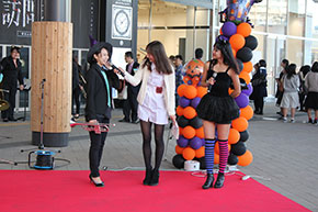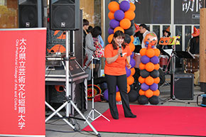 大分駅で10月31日(土)に開催されたハロウィンイベントで、音楽科と専攻科の9名の学生が仮装して演奏を披露しました。ステージは人通りの多い、大分駅北側。ハロウィン当日とあって、多くの人々が思い思いの仮装をしていました。学生たちも魔女の帽子やモンスターのかぶり物を身につけ、会場を盛り上げました。