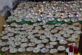 当日は13時に大分県立芸術文化短期大学を出発、15時から昨年の「ギネスに挑戦アートスネークプロジェクト」で使った竹で作るキーホルダーのワークショップを竹田町元岡本屋で実施しました。同時に、竹田のことや環境に関するスタンプラリーを実施しました。18時、竹ほたる点灯と同時にキャンドルに点火しました。キャンドルは天ぷら油を固めて作りました。キャンドルホルダーは牛乳パックで作り、四角い窓を開けて、周囲に再生紙で作った紙を巻きそこに思い思いの絵を描きました。大分市の上野愛光保育園、ふたば保育園の子どもたちが書いてくれた絵のキャンドルを豊後竹田駅前の噴水周辺に、竹田市の豊岡小学校が書いてくれた絵と中学生の水墨画のキャンドルを八幡川横丁に飾りました。ちょうどCOP21が開催されていました。この美しい環境が子どもたちに引き継がれるようにみんなで考えたいと思います。