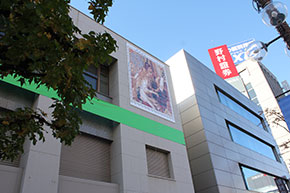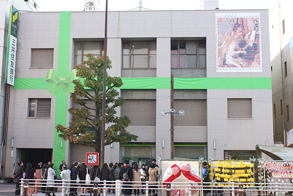 モザイクアートはルノアールの「ピアノを弾く少女たち」をモデルに市民のみなさんにご協力いただき制作しました。縦4.5メートル、横3.5メートルの大きさで、1センチ四方の色紙を13万2000枚使用しています。三井住友銀行大分支店を緑のリボンでラッピングし、切手の形のモザイクアートを貼っています。