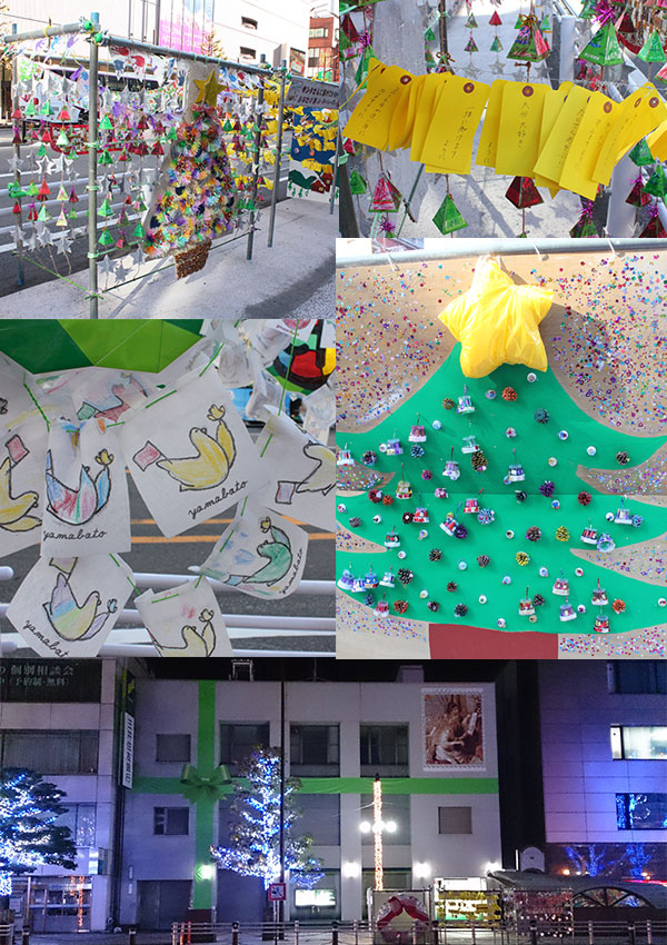 巨大モザイクアートは、12月25日(金)まで三井住友銀行大分支店に展示されます。ベストな観覧場所は府内5番街の赤レンガ館前です。ぜひ足をお運びください。また展示場所へ誘導する、市内の幼稚園児や小学生が作ったかわいいガーランドを設置しています。こちらも併せてご覧ください。