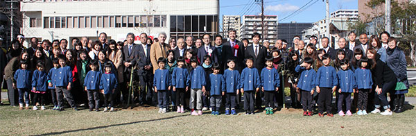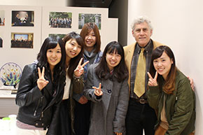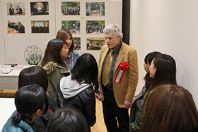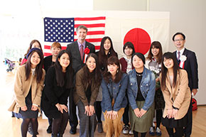 また、前日の「日米友好の木イニシアティブ ハナミズキ植樹式」(大分市オースチン市姉妹都市提携25周年記念)では、ドイッチュさんらが大分いこいの道に植樹を行いました。その後の交流会で本学国際総合学科の学生24名が、ドイッチュさんや在福岡アメリカ領事館首席領事のユーリー・フェッジキフさんを取り囲み、英会話を楽しみました。学生たちは「ドイッチュさんに今度アメリカに行く話をしたら、『その都市は農業が盛んだ』とか、いろいろな情報を教えて下さいました。ゆっくりしゃべってくれたのでわかりやすかったです」、「日本語が堪能な首席領事から『将来のことをボキャブラリーがなくても大丈夫だから英語で話してみて』と言ってもらえたので安心して話すことができました。『話して、話して、失敗してこそ学ぶ事がある。とにかく話して、恐れるな』と応援してもらいました」と話しました。