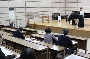 小林客員教授はまた、音楽との向き合い方として田村和紀夫氏の著書『音楽とは何か』を取り上げ、「いかに我々が何も考えずに音を出しているか考えさせられる一冊なので学生のみなさんは読んでみてください」と話しました。そして練習について「色々なことをやってみてください」とエールを送りました。