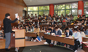 新入生オリエンテーションを4月6日(水)~8日(金)に実施しました。本学の教育目的・方針や学生生活の心構え、科目の履修方法の説明、防犯講話のほか、学科に分かれて教員紹介や交流会などを行いました。教務学生部長の吉山教授は「みなさんは、教えてもらい学ぶ『生徒』ではなく、自ら学ぶ『学生』になりました。自らを半分は社会人と考え、社会人として相応しい行動をとってください。」と述べ、新入生を激励しました。
