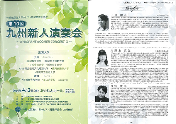 「九州新人演奏会」は、一般社団法人 日本ピアノ調律師協会の主催で、九州と韓国を代表する音楽大学から選りすぐりのピアニストが一堂に会する演奏会です。今回は、九州7大学と韓国2大学から9人のピアニストが競演しました。