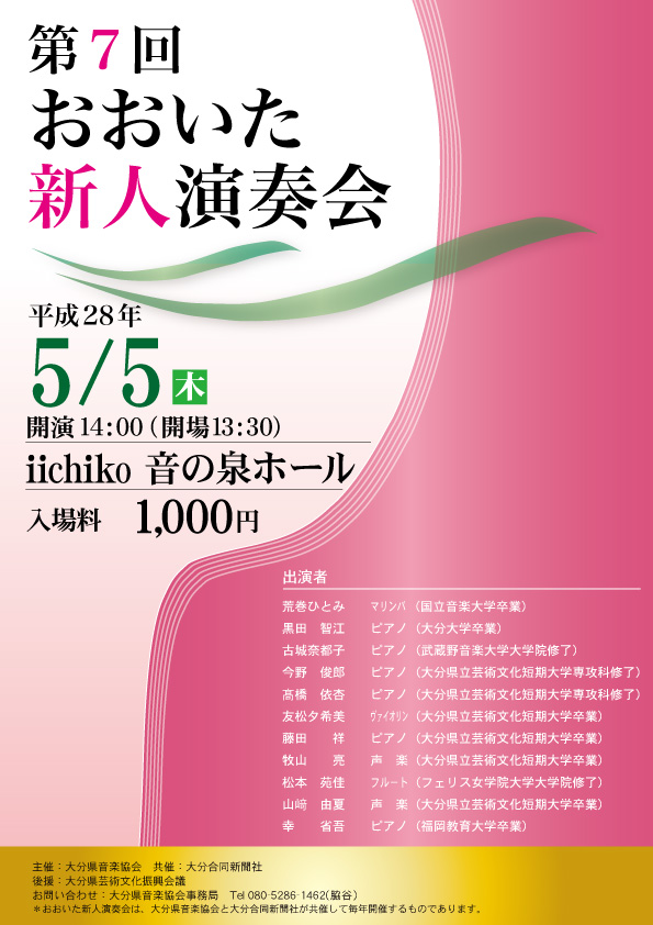 なお、今野 俊郎さんを含む本学の卒業生・在校生も出演する「第7回おおいた新人演奏会」が2016年5月5日(木)にiichiko音の泉ホールで開催されます。是非そちらもご覧ください。