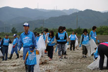 海洋汚染やウミガメについて話を聞いて、海岸の清掃、海辺の植物群落を守り、ウミガメの産卵に適した海岸にするため、自然に返る素材でつくった防砂竹垣の設置を行いました。そのあと、地元の人たちがつくってくれた豚汁とおにぎりをごちそうになりました。