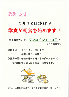 朝食を摂らない大学生が多いと言われる昨今、本学では学生の健康増進と生活習慣の見直しを目的に、学生食堂で朝食サービスを5月12日(木)から始めます(1日30食限定)