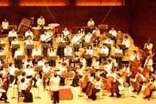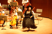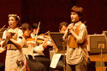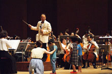 前半は、森口准教授の指揮によるオーケストラ演奏で、魔法をテーマにした管弦楽曲を3曲演奏しました。当日会場は、ファミリーコンサートということで、子ども連れが多く、親子で一緒にコンサートを楽しんでいる様子があちこちで見られました。森口准教授は、曲の合間には、子どもたちにもわかるように曲目解説を加えながら進め、「あなたも指揮者コーナー」では、くじ引きで選ばれた5歳ほどの小さな子ども相手に、苦戦しながら指揮の指導も行っていました。指揮をする小さな子どもの真剣な姿とほほ笑ましい仕草に会場はあたたかい拍手で包まれました。
