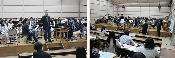 はじめに松倉利之教授より挨拶があり、その後、講師を務める森口真司准教授が、音楽科のウィンドオーケストラによる公開リハーサルを行い、それをお手本に、3名の受講者が指揮をしました。