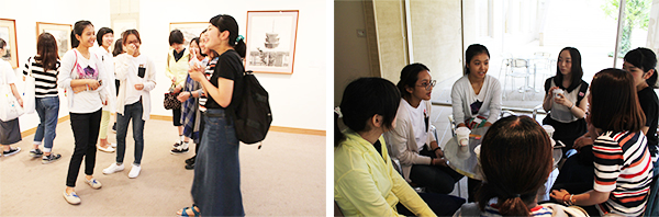 彼女たちは、常設展(福田平八郎・高山辰雄の作品を中心とした日本画や田能村竹田の作品など)を一緒に観覧しながら描かれている絵を前に英語で語り合い、その後、ティーラウンジで意見交換をすることで、実践的な英会話の涵養も出来ました。