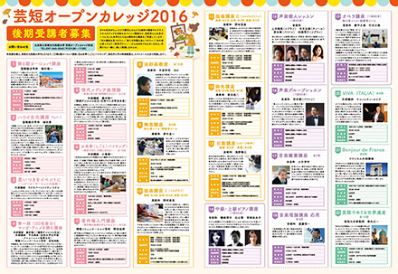 社会全体の学習ニーズの高まりに応え、地域社会に幅広い生涯学習の機会を提供することを目的とした「芸短オープンカレッジ2016」の後期の受講者を募集します。