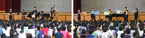 佐伯市立鶴岡小学校で9月12日(月)、地域巡回演奏会を開催しました。本学音楽科学生ら22名が全校児童、教員、地域住民ら約540名を前に、オペラハイライト、ピアノソロ・連弾、クラリネット独奏、弦楽五重奏、金管5重奏・女声合唱を披露しました。