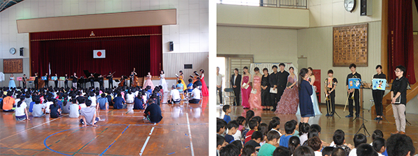津久見市立津久見小学校で、9月13日(火)地域巡回演奏会を開催しました。本学音楽科学生ら23名が全校児童、教員、地域住民ら約300名を前に、オペラハイライト、ピアノソロ・連弾、クラリネット独奏、弦楽五重奏、金管5重奏・女声合唱を披露しました。
