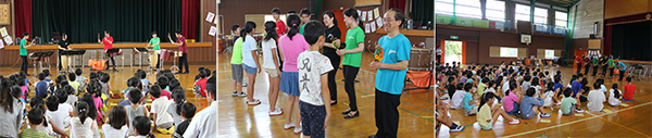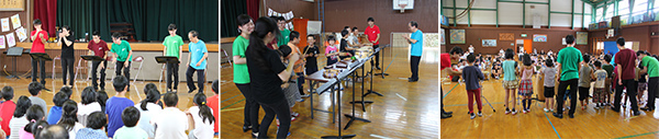 コンサートの途中には楽器体験コーナーもあり、競うように手を上げ指名された児童が次々に前に出てきては楽器の演奏の仕方を習い、みんなの前で楽しそうに演奏を披露しました。児童は「たたくのは簡単だけど、リズムをとるのは難しかった。」と話し、学生たちは「指導した子供たちの反応が可愛くて楽しかった。」と感想を述べました。
