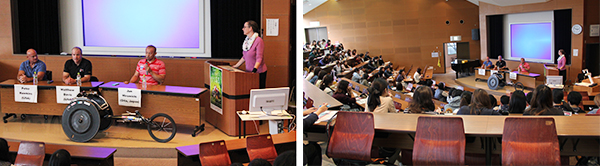 トーク終了後、学生からはいくつか英語で「レース直前にはどのような気持ちでいますか?」など、質問が寄せられました。選手たちは、「大会にはもう何度も参加しているけれども、レース前はつねに不安と緊張でいっぱい。」とのことでした。特別な車椅子(レーサー)を使うので、何らかのアクシデントも少なくないそうです。しっかり準備をしても、不安は消えないそうです。すべてのことにいえますが、何事も準備が大切とのことです。