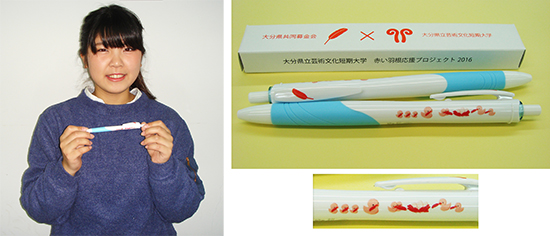 今年のボールペンの赤い羽根をデザインした、美術科デザイン専攻プロダクトデザインコース2年の富 歩美さんは、「小さな力でも、みんなで力を合わせれば大きな力となります。募金活動も同じです。それを表現したくて、小さな鳥と大きな鳥が力を合わせて赤い羽根を使用し卵を育てているデザインにしました。」と話しました。