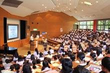 今年も多くの生徒さん、保護者の方、教員の方々にお集まり頂き、全体説明会は「大講義室」とサテライト会場として使用した「視聴覚室」と「101講義室」、「102講義室」の4会場で実施しました。