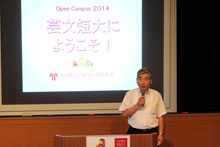 全体説明会では、今年度の学友会会長 山口奏子さんが司会進行を務め、最初に中山欽吾学長より「先生との距離が近く、4学科みんなが顔を合わせ交流できるのは小さな学校ならではです。また、就職、進学と2年間学んだ後に、もう一度進路を見直すことができるというのが短大の魅力でもあります。今日は各学科でさまざまなプログラムを用意して密度の濃い内容となっています。先輩たちもたくさん参加していますので、いろんな場面を見て、そしてたくさん質問をして、この芸文短大の魅力を知ってください」と話しました。
