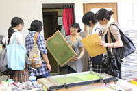 「学科紹介」「学科入試説明会」「在学生によるキャンパスライフ紹介」「授業風景・取り組みなどのスライド上映」「学科施設見学」などを行いました。美術科は午前中から教室・工房等を開放、施設内見学やシルクスクリーン、パソコン操作などを体験するワークショップを実施しました。「在学生によるキャンパスライフ紹介」では、現役学生らがスライドを使って授業や制作風景をはじめ、登校時やランチタイムの様子など学生生活の様子を紹介しました。