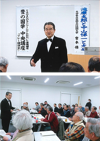 「豊の国学」とは、中央講座・分野別講座・関連講座及び協賛講座からなり、様々な角度から豊の国(大分県)を学ぶものです。さらに、大分の「人」、「文化」「産業」、「自然」に分類され、さらに深く学ぶことができます。今回、宮本特任教授は、大分の「人」の分野で講演しました。