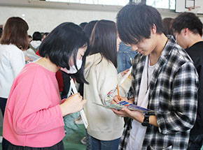 情報コミュニケーション学科では、自分から積極的に声をかけ、新しい出会いをつくるゲームを行いました。新入生は最初は緊張している様子でしたが、すぐに打ち解け合い、楽しそうな笑い声と笑顔が印象的でした。